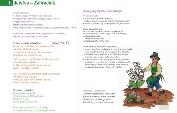 - dejstvo Mamičke (básnička + pesnička pre mamičku, básnička vyjadruje podobenstvo – tak, ako sa záhradník stará o kvety, tak sa i mamičky starajú o svoje deti.